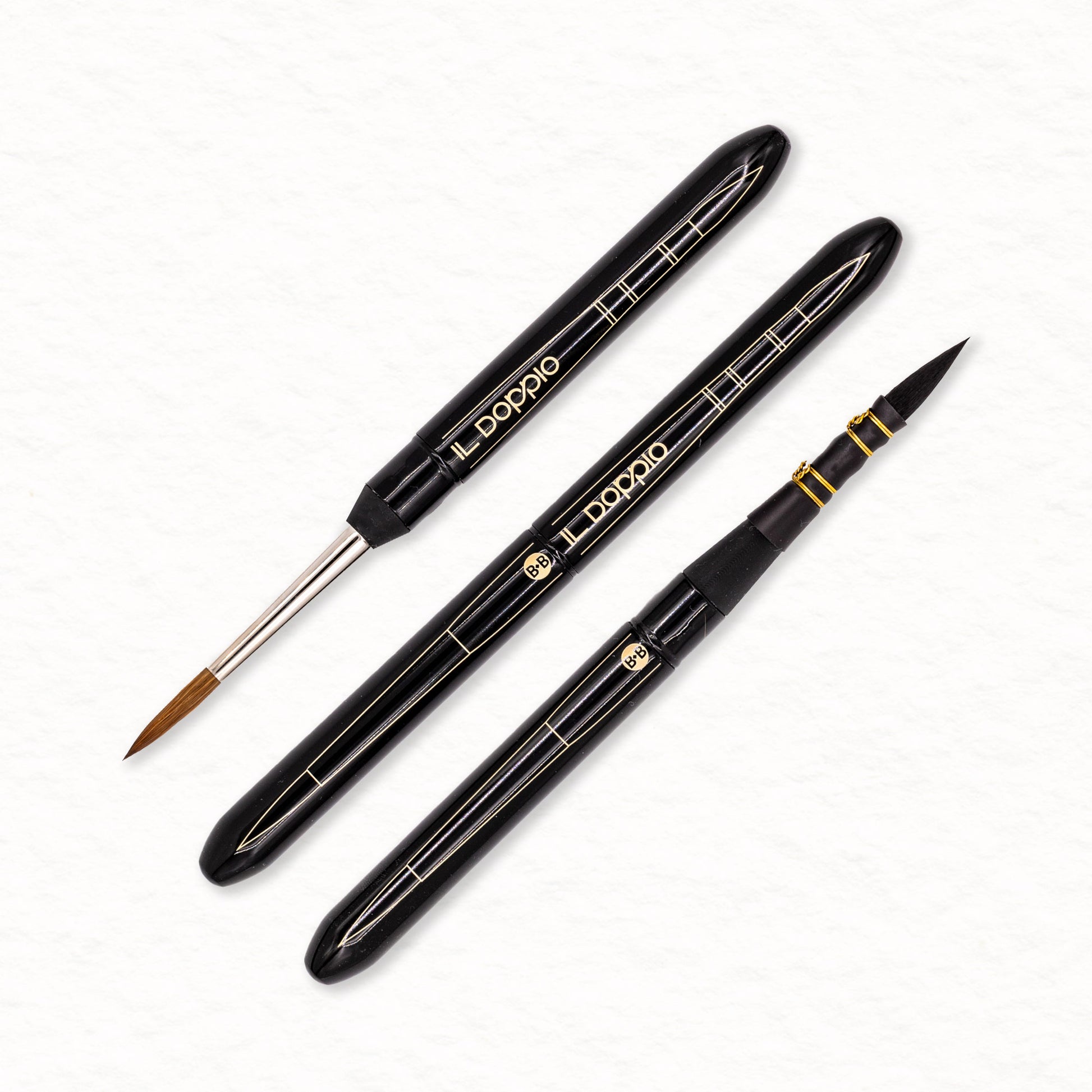 Il Doppio est le premier pinceau de voyage à double tête et deux capsules refermables — la solution idéale pour les artistes qui souhaitent toujours emporter un instrument polyvalent, précis, pratique et fonctionnel, lors de leurs voyages et de leurs séances de peinture en plein air ou en dehors de l'atelier.